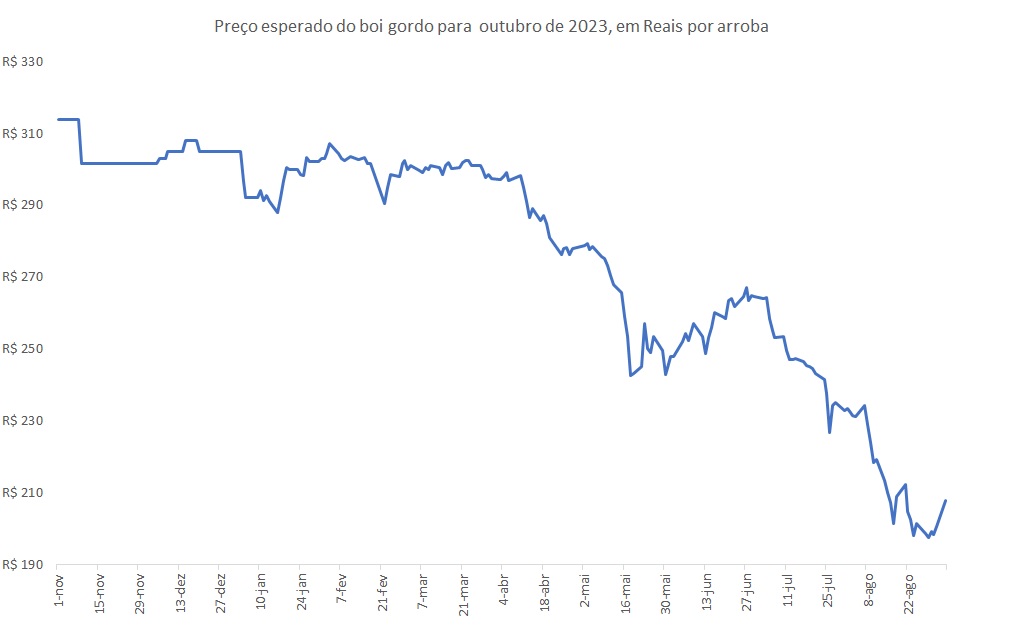 Após recuperar o patamar de R$200,0 por arroba para outubro de 2023 (BGIV23) no primeiro dia de setembro (clique aqui), o preço esperado do boi gordo para o vencimento acumulou o segundo dia consecutivo de ganho, se distanciando da mínima, encerrando o dia (4 de setembro) a R$207,8 por arroba. Vale lembrar que o contrato para vencimento em outubro chegou a ser cotado a R$197,5 por arroba em agosto (27), como ilustra a Figura abaixo.