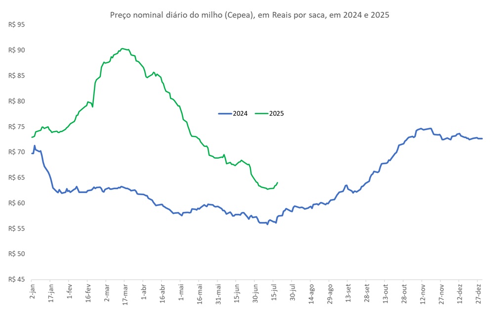 O preço do milho (Cepea) foi cotado a R$64,0 por saca em julho (22), valor 4,4% abaixo do preço que encerrou junho (R$67,0) e 11,9% menor que o último preço de 2024 (R$72,7). No entanto, o valor mostrou recuperação desde que alcançou a mínima do ano ainda em julho, quando foi cotado a R$62,7 por saca.