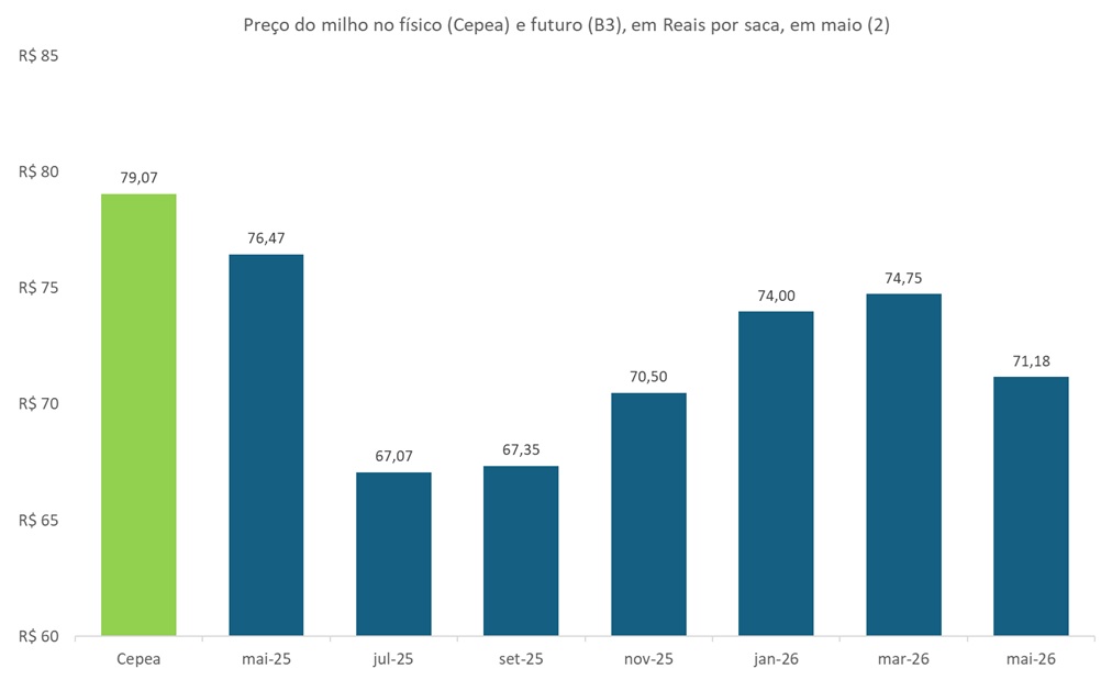 A Figura abaixo apresenta dados de preço do milho no mercado físico (Cepea) e dos contratos futuros, segundo B3, entre maio de 2025 e maio de 2026, em Reais por saca, no dia 2 de maio.
