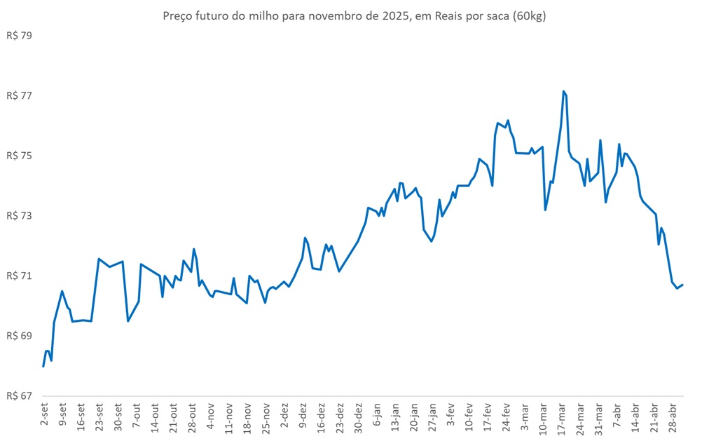 O preço futuro do milho para novembro de 2025 após um mês de abril em queda, iniciou maio mais estável e relativamente próximo dos valores mínimos para o vencimento, o que pode sugerir, ao menos, uma menor pressão de queda.