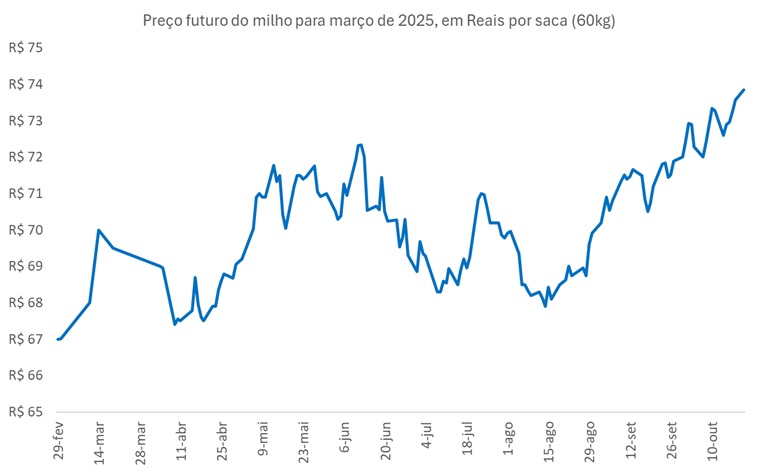 O preço futuro do milho para março de 2025 segue movimento de alta, renovando a máxima para o vencimento, cotado em patamares próximos de R$74,0 por saca em outubro (21).