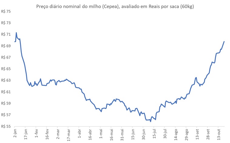 O preço médio do milho na parcial de outubro de 2024 de R$67,2 por saca foi a maior média nominal desde abril de 2023, quando o valor nominal foi de R$74,9 por saca. Aliás, a perspectiva é que o preço do milho volte a ficar acima de R$70,0 por saca, como mostram os dados do preço esperado do milho para os contratos em aberto de maior liquidez na parcial de outubro (21).