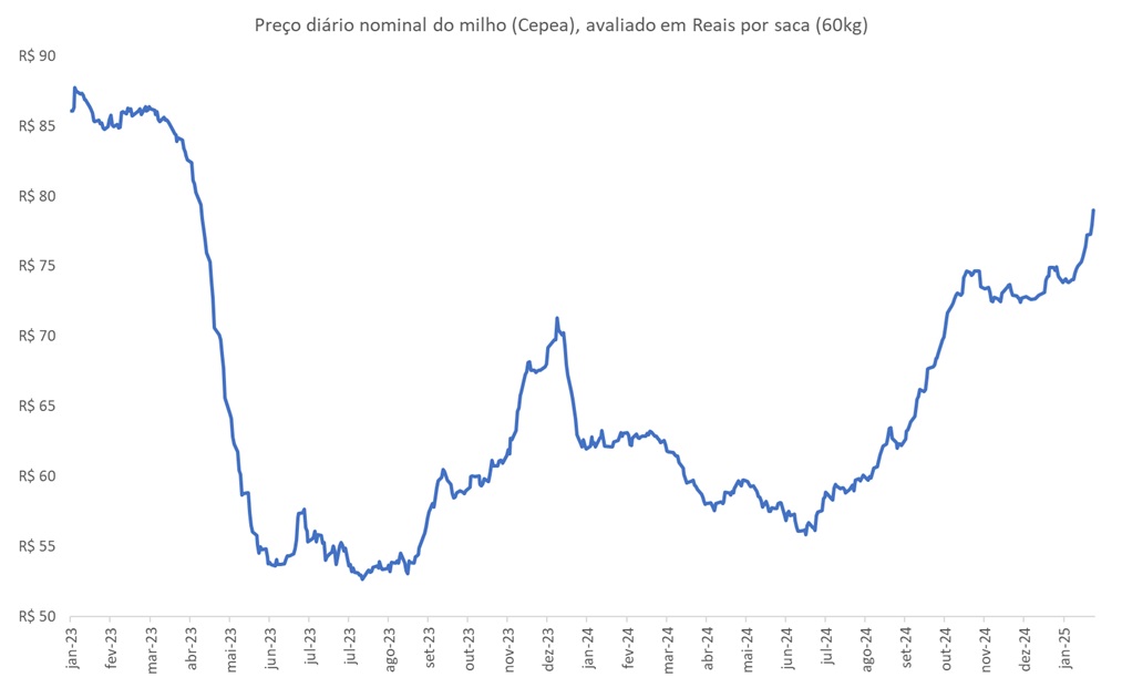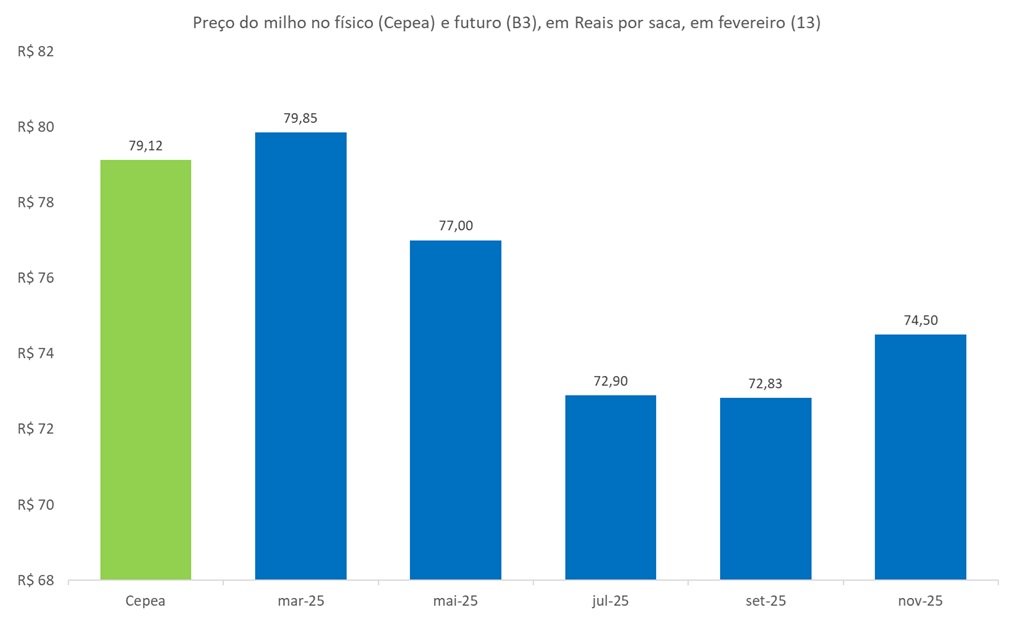 Na parcial de fevereiro, até o dia 13, o preço médio do milho de R$77,1 por saca foi 23,1% maior que a média nominal de fevereiro de 2024 (R$62,6) e no maior valor médio nominal desde março de 2023.