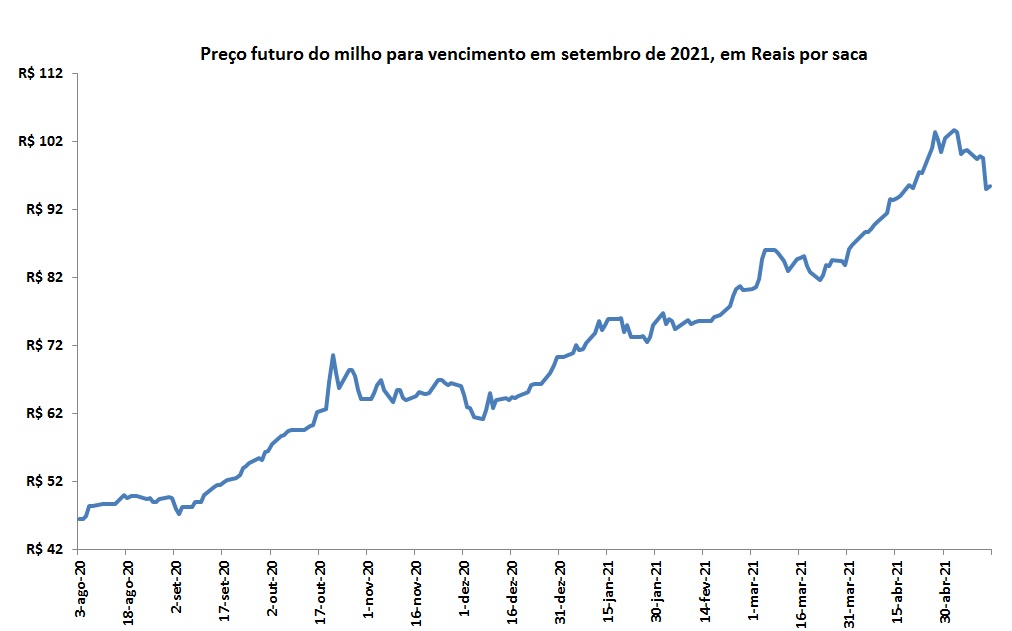 O preço futuro do milho para vencimento em setembro de 2021 foi cotado a R$95,55 por saca no dia 14 de maio, valor 7,8% abaixo da máxima do contrato, de R$103,73 observado no dia 3 de maio.