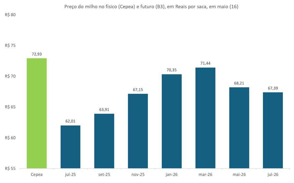 A Figura abaixo apresenta dados de preço do milho no mercado físico (Cepea) e dos contratos futuros, segundo B3, entre julho de 2025 e julho de 2026, em Reais por saca, no dia 16 de maio.