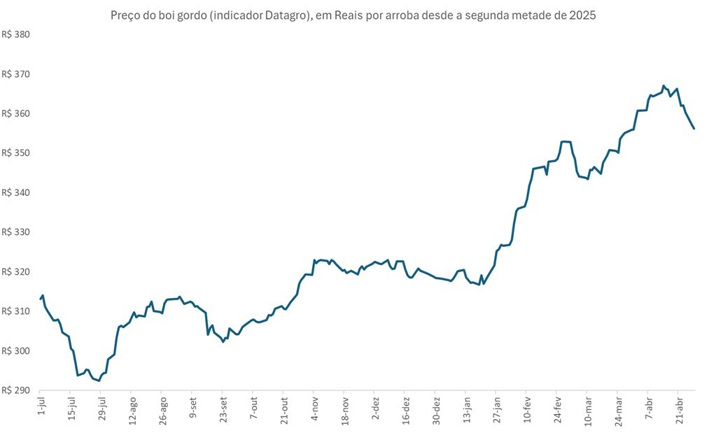 A referência do mercado futuro, o indicador Datagro (primeira Figura), segue em queda, cotado a R$356,3 por arroba em abril (28) e praticamente no mesmo valor que encerrou março (R$356,0). Em outras palavras, o preço do boi gordo, após renovar a máxima em abril, praticamente devolveu todo ganho observado no mês. No ano, contudo, o indicador acumula alta de 11,8%, uma vez que encerrou 2025 cotado a R$318,4 por arroba.