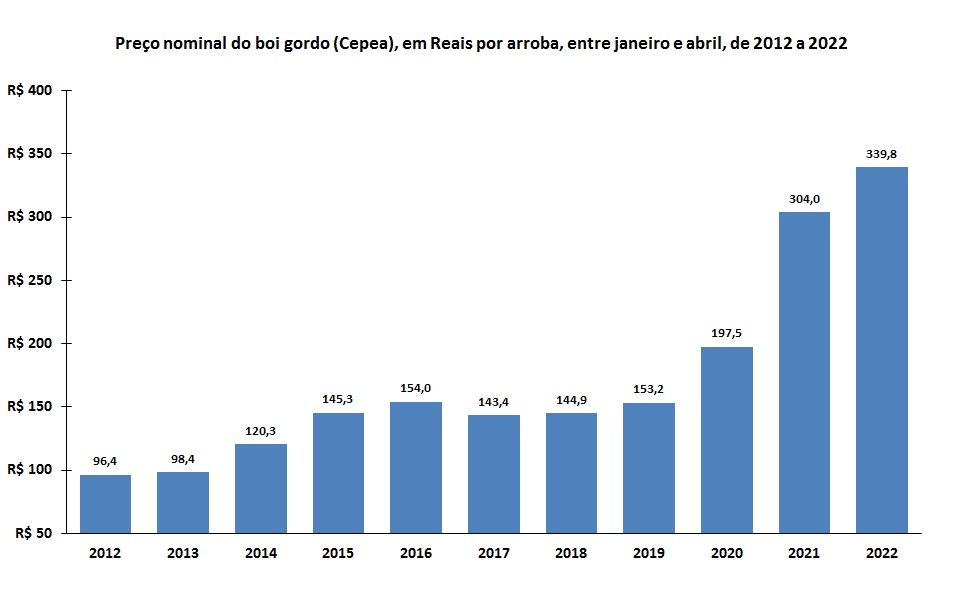 O preço médio do boi gordo entre janeiro e abril de 2022 de R$339,8 por arroba foi o maior valor nominal da série do Cepea e, 11,8% acima de 2021 (R$304,0).
