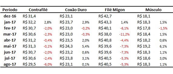 O contrafilé e o filé mignon apresentaram queda de 6,0% e 5,3%, respectivamente, quando comparados a média de preços praticados em dezembro de 2016. Por outro lado, o músculo e o coxão duro subiram de preços, ainda que ligeiramente. O músculo valorizou 1,1% e o coxão duro apenas 0,1%.