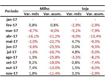 O objetivo é avaliar a variação de preços dos grãos em 2017. E a Tabela a seguir apresenta os dados da variação mensal e acumulada de preços do milho e da soja, em 2017 (até novembro) segundo dados do Cepea/Esalq.