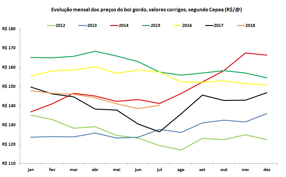 Pois é, mas vale destacar que em 2017 os preços do boi gordo sofreram forte influência negativa dos efeitos da Operação Carne Fraca, especialmente no primeiro semestre do ano passado (clique aqui).