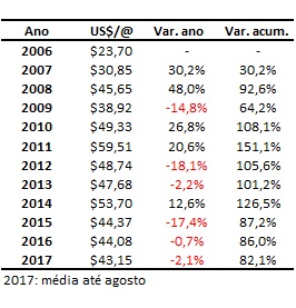 Atualmente (2017, até agosto), o preço médio do boi gordo está em US$43,15 e abaixo da média avaliada desde 2006 que é de US$44,14.