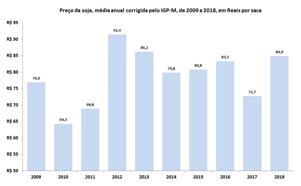 Em 2018 o preço médio da soja foi de R$84,3 por saca, em valor nominal, o que representa alta de 18,3% em relação a média observada em 2017, de R$71,3 por saca. Vale lembrar o preço médio anual de 2018 foi o maior de toda série histórica iniciada em 2009.