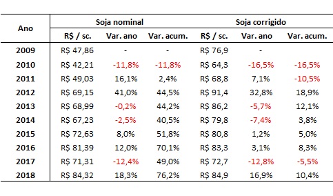 O importante é considerar que no acumulado da última década, de 2009 a 2018 a soja acumula alta de 76,2% em valor nominal. Com tudo, quando considerando o valor corrigido pela inflação, neste caso, o IGP-M, a alta é de apenas 10,4% no mesmo período.