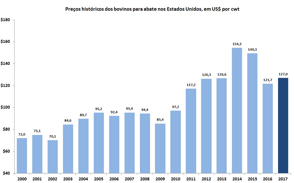 A Tabela abaixo destaca os números em termos médios anuais dos preços históricos dos bovinos para abate (considerando a média de novilhos e novilhas) nos Estados Unidos desde o ano 2000, segundo dados do USDA.