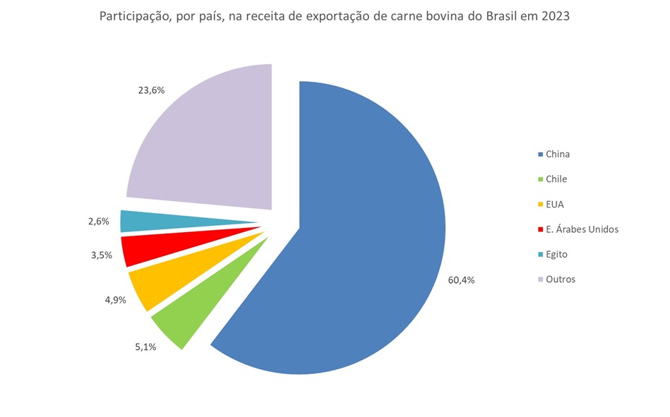 A China foi o maior entre os principais importadores de carne bovina do Brasil em 2023, participando com mais de 60,0% da receita total de venda no ano.