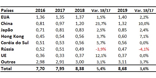 E dentre os principais importadores de carne bovina, destaque para os Estados Unidos, maior comprador mundial ao longo dos últimos anos. Apesar dos EUA serem os maiores importadores mundiais de carne bovina, a China vem aumentando suas compras e em 2019 a expectativa é que as compras chinesas fiquem bem próximas da observada nos Estados Unidos (1,32 milhões de toneladas).