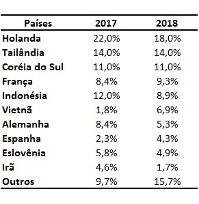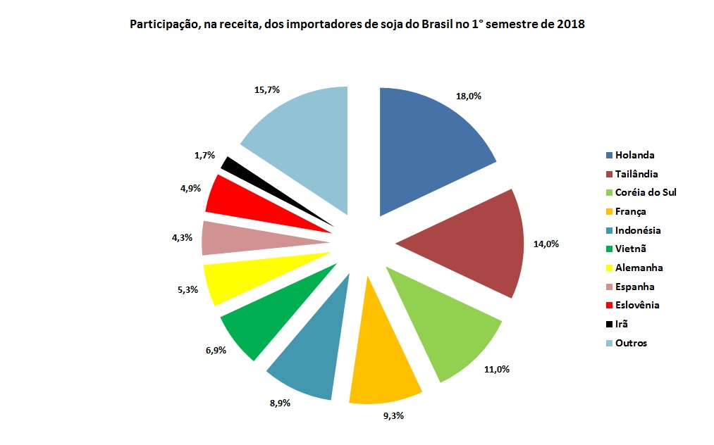 Os holandeses foram responsáveis por 18,0% da receita com a exportação de farelo de soja nacional no 1° semestre de 2018. Apesar de ser o maior importador, houve uma redução das compras da Holanda em relação ao mesmo período do ano passado, quando o país foi responsável por 22,0% das compras do produto.