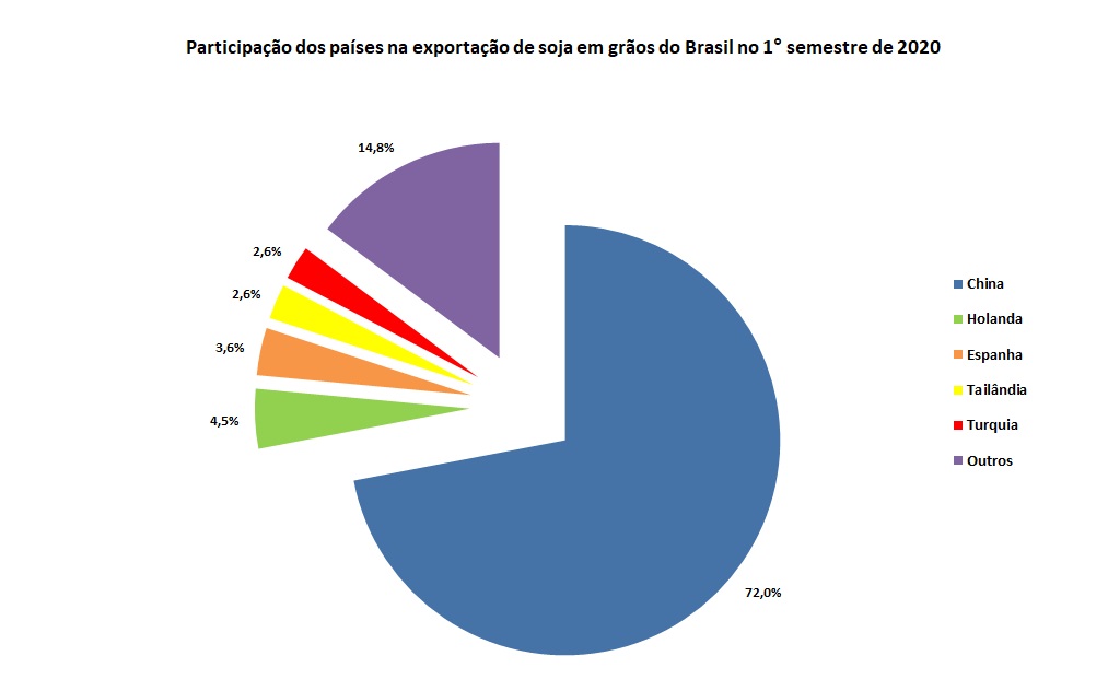 A China tem sido o destaque dentre os principais importadores soja em grãos do Brasil com participação de 72,0% no faturamento na parcial de 2020.
