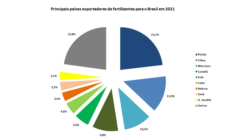 A Figura abaixo ilustra a participação, no faturamento, dos principais países exportadores de adubos e fertilizantes do Brasil em 2021.