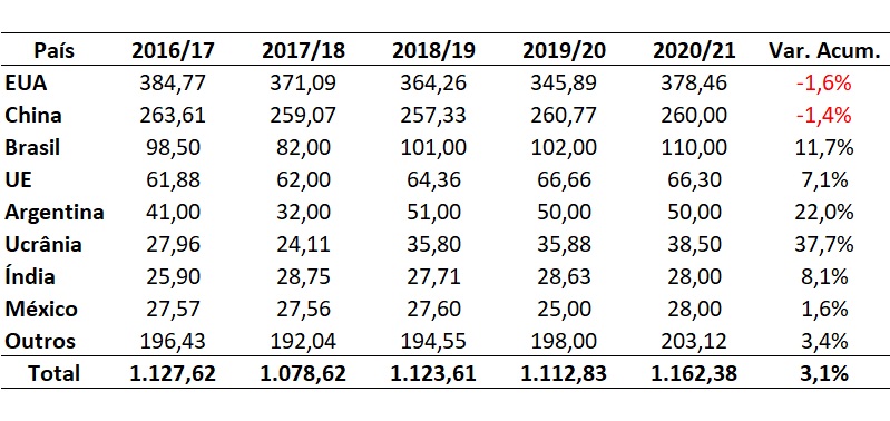 A Tabela a seguir apresenta os dados de produção, em milhões de toneladas, dos principais produtores mundiais entre as safras 2016/17 a expectativa para 2020/21, segundo dados do USDA.
