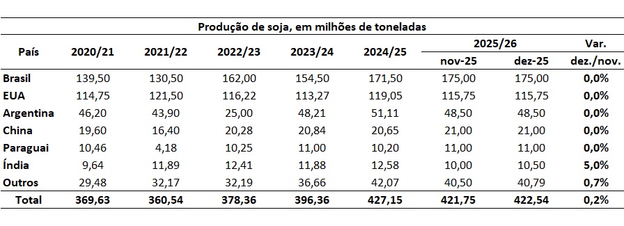 A estimativa de produção entre os principais produtores de soja ficou estável em dezembro de 2025, com exceção da Índia. Isso porque a previsão é que a produção indiana aumenta 0,50 milhão de toneladas frente a revisão anterior e alcance 10,50 milhões de toneladas (Tabela acima).