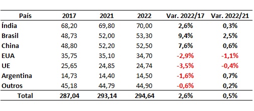 A Tabela a seguir apresenta os dados da produção de bezerros e bezerros total e por país, em milhões de cabeças entre 2017 e a expectativa para 2022, segundo dados do USDA publicados em outubro de 2021.