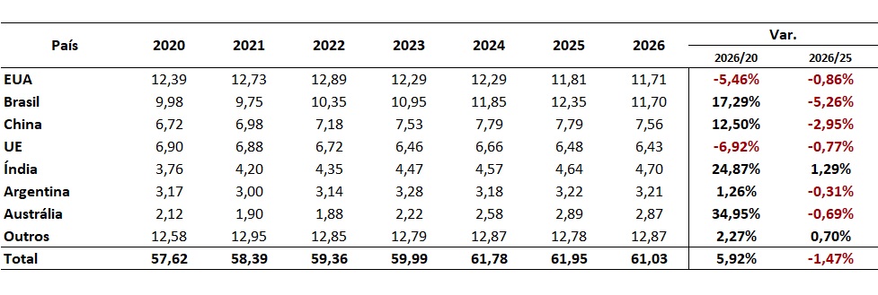 Após o recorde esperado em 2025, a produção mundial deve cair sensivelmente, para 61,03 milhões de toneladas em equivalente carcaça ou cerca de 0,90 milhão de toneladas. A expectativa de queda na produção do Brasil é o principal fator que contribui para essa redução na oferta mundial de carne bovina.