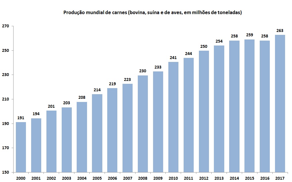 Aliás, neste ano de 2017 a produção de carnes no mundo deve atingir patamar recorde e acima de 260 milhões de toneladas pela primeira vez na história (considerando bovinos, suínos e aves).