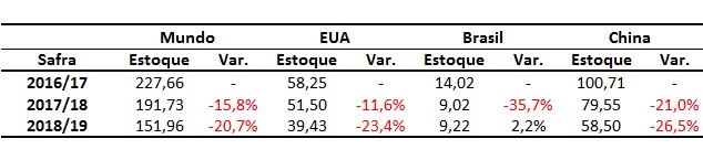 Isso porque a expectativa de queda nos estoques mundiais de milho é de 20,7% na safra 2018/19 frente ao estoque final da safra 2017/18. A queda dos estoques de milho nos EUA e na China no período é de 23,4% e 26,5%, respectivamente.