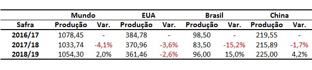 Os Estados Unidos, maior produtor mundial, deve produzir 361,46 milhões de toneladas de milho queda de 2,6%, enquanto a China de colher 225,00 milhões de toneladas, alta de 4,2 em relação a safra 2017/18. O Brasil espera colher 96,00 milhões de toneladas na safra 2018/19 segundo USDA, o que representa uma alta de 15,0%.
