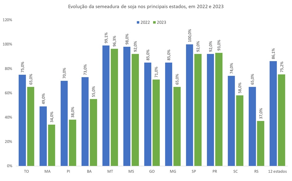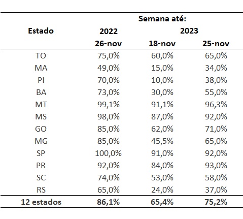 Os dados gerais (média dos 12 principais estados produtores) mostram que a semeadura alcançou 75,2% da safra em 2023, até a parcial de novembro (25) enquanto em 2022, no mesmo período, o valor foi de 86,1%, como revelam os dados da Figura abaixo.