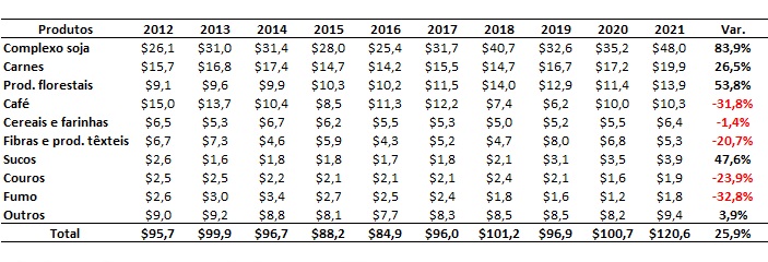 E o destaque de crescimento em 2021 foi para os produtos do completo soja (soja em grãos, farelo etc) que somaram o equivalente a US$48,0 bilhões em vendas, valor 36,3% acima do observado em 2020 e 83,9% acima do valor registrado há 10 anos atrás, em 20212 (Tabela). O setor de carnes também apresentou forte crescimento, renovando o patamar histórico, próximo de alcançar a marca de US$20,0 bilhões em vendas no ano. Certamente esse patamar seria alcançado caso não houvesse a suspensão temporária dos embarques de carne bovina do Brasil para a China.