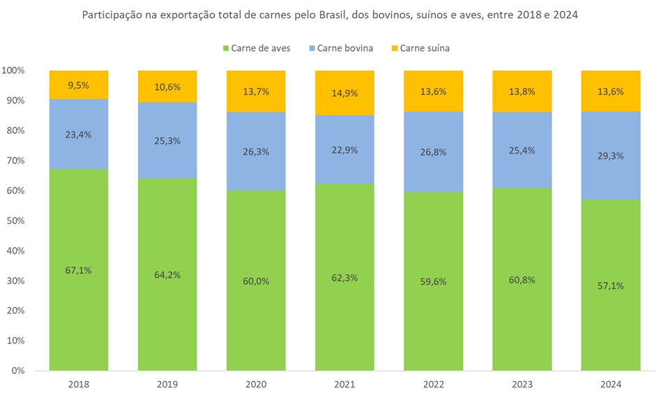 A participação da carne bovina no total de carnes (bovina, suína e aves) exportada do Brasil passou de 23,4% em 2018 para 29,3% em 2024. E enquanto a participação da carne bovina subiu ao longo dos últimos anos, a importância da carne de aves diminuiu (Figura), embora ainda permaneça na liderança de vendas. A participação da exportação de carne suína também subiu, passando de 9,5% em 2018 para 13,6% em 2024.