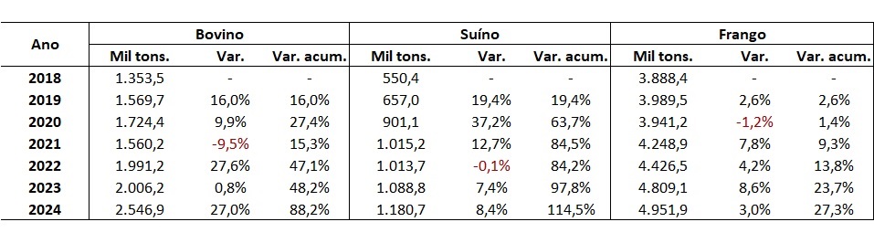A Tabela apresenta os dados de exportação de carne bovina, suína e de aves, em mil toneladas, no acumulado entre janeiro e dezembro, de 2018 a 2024, segundo dados da COMEX.