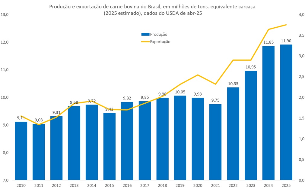 Antes, vamos apresentar os dados de produção e exportação de carne bovina do Brasil, segundo USDA, avaliados em milhões de toneladas em equivalente carcaça, de 2010 à estimativa de 2025, segundo dados de abril (primeira Figura).