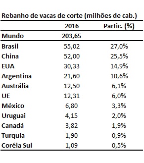 A Tabela a seguir destaca os dados de rebanhos de vacas de corte, por país produtor, no ano de 2016, segundo dados do USDA.