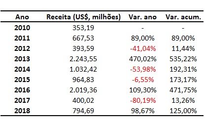 Contudo, quando comparado ao 1° quadrimestre de 2016 (US$2,0 bilhões) a receita de 2018 é cerca de 60,0% menor.