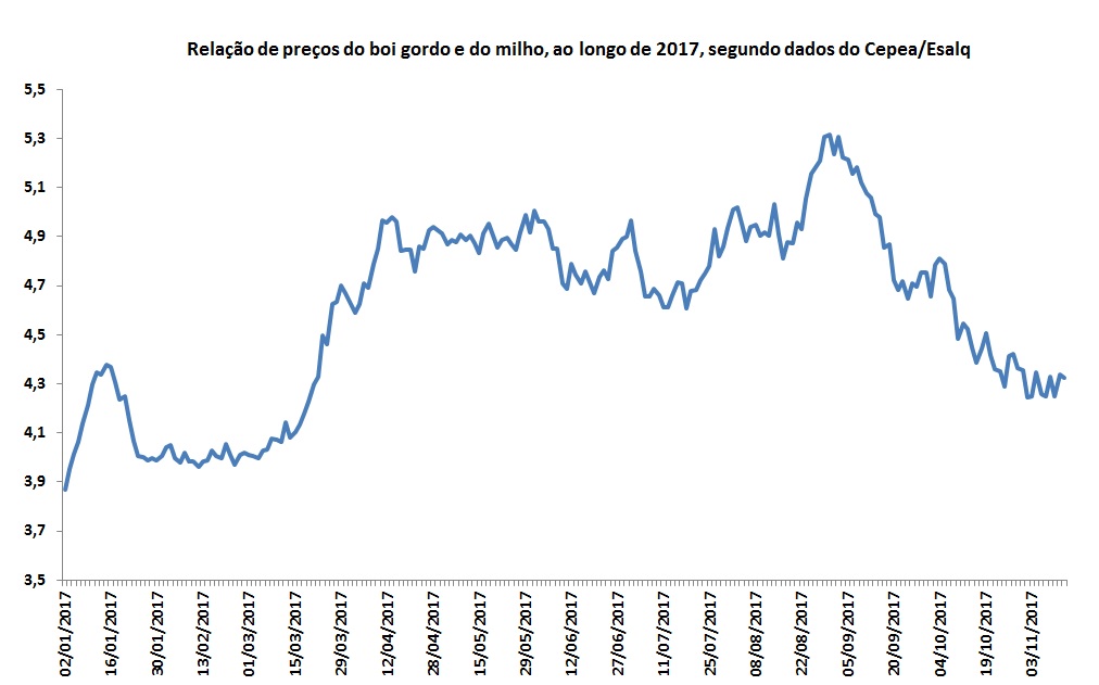 Em agosto de 2017 era possível adquirir mais de 5,0 sacas de milho (60kg) por arroba de boi gordo, segundo dados do Cepea. Atualmente (início de novembro), essa relação está perto de 4,3 sacas de milho por arroba de boi gordo.
