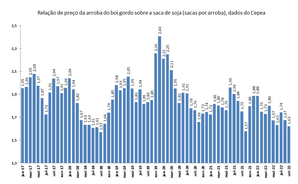 O indicador médio de sacas de soja por arroba de boi gordo foi de 1,62 na parcial de setembro de 2022 (até o dia 19) e o menor valor desde outubro de 2021 (1,57).