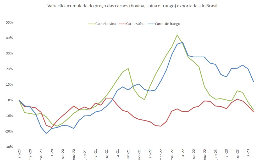 O fato é que entre janeiro de 2020 e agosto de 2023 o preço da carne bovina exportada pelo Brasil acumulou queda de 6,2%, enquanto a carne suína caiu 7,5% no mesmo período. A carne de frango exportada pelo Brasil, contudo, subiu entre janeiro de 2020 e agosto de 2023, com ganho de 11,8%.
