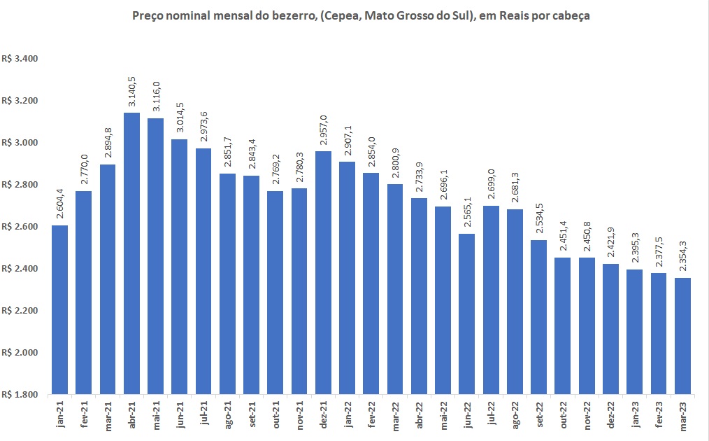 Nos últimos 5 meses, entre novembro de 2022 e a parcial de março de 23, a queda média mensal do preço do bezerro (Cepea, Mato Grosso do Sul) foi de 0,8%. Antes de novembro de 2022 as quedas mensais foram maiores, em geral próxima de 2,4%.