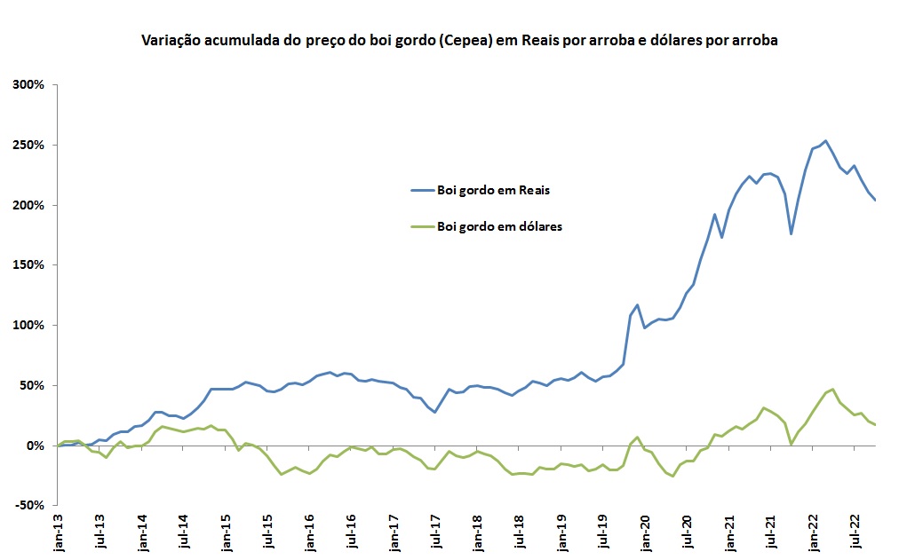 O fato é que o preço do boi gordo em Reais por arroba acumulou alta de 204,5%, com o preço nominal (Cepea) evoluindo de R$97,5 por arroba em janeiro de 2013 à R$297,0 por arroba na parcial de outubro de 2022 (28). Em dólares por arroba a variação acumulada no mesmo período ficou em apenas 17,7%.