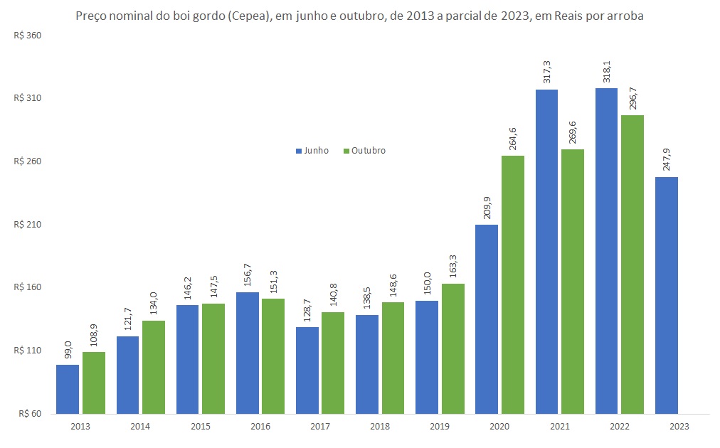 A Figura ilustra a evolução do preço nominal do boi gordo (Cepea), em Reais por arroba, nos meses de junho e outubro, entre os anos de 2013 e a parcial de 2023 (média de junho até o dia 28).