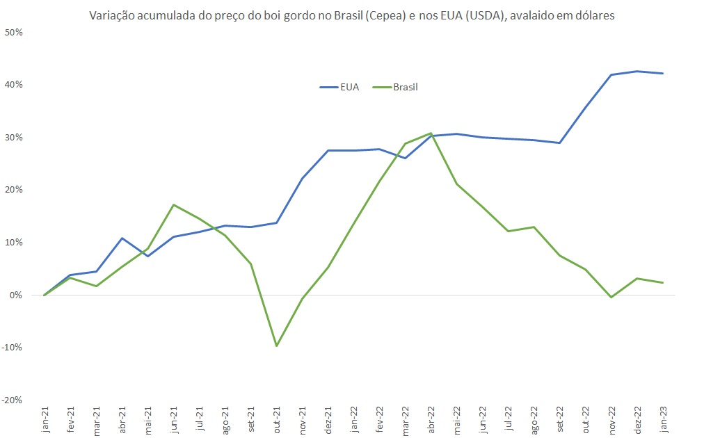 Entre janeiro de 2021 e janeiro de 2023, o preço do boi gordo (“USDA – Steer, 65-80% Choice”), por exemplo, acumulou valorização de 42,3%, enquanto no mesmo período o preço do boi gordo (Cepea) avaliado em dólares acumulou leve ganho de 2,3%.