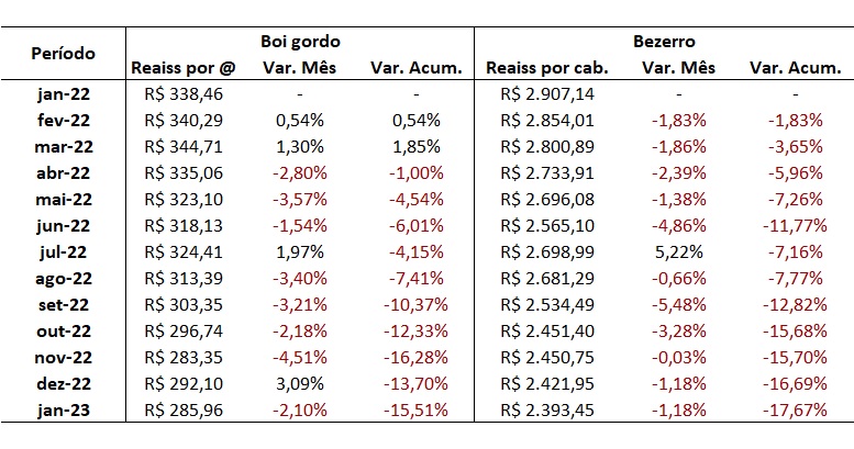 A Tabela a seguir apresenta os dados médios nominais do preço do boi gordo (Cepea) em Reais por arroba e do bezerro (Cepea, Mato Grosso do Sul), em Reais por cabeça e a respectiva variação mensal e acumulada entre janeiro de 2022 e janeiro de 2023 (dia 26).