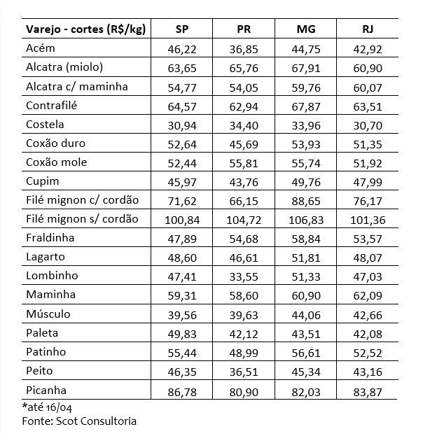 Por outro lado, no Paraná, a média subiu 0,9%, com 13 cortes em alta, seis em queda e dois estáveis. A maior variação foi observada no contrafilé, com alta de 4,1%.