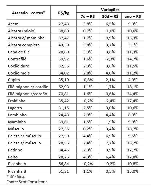 Já os cortes do dianteiro tiveram aumento médio de 2,7%, com cinco cortes em alta e um em queda, com destaque para a paleta com músculo, que avançou 4,4%.